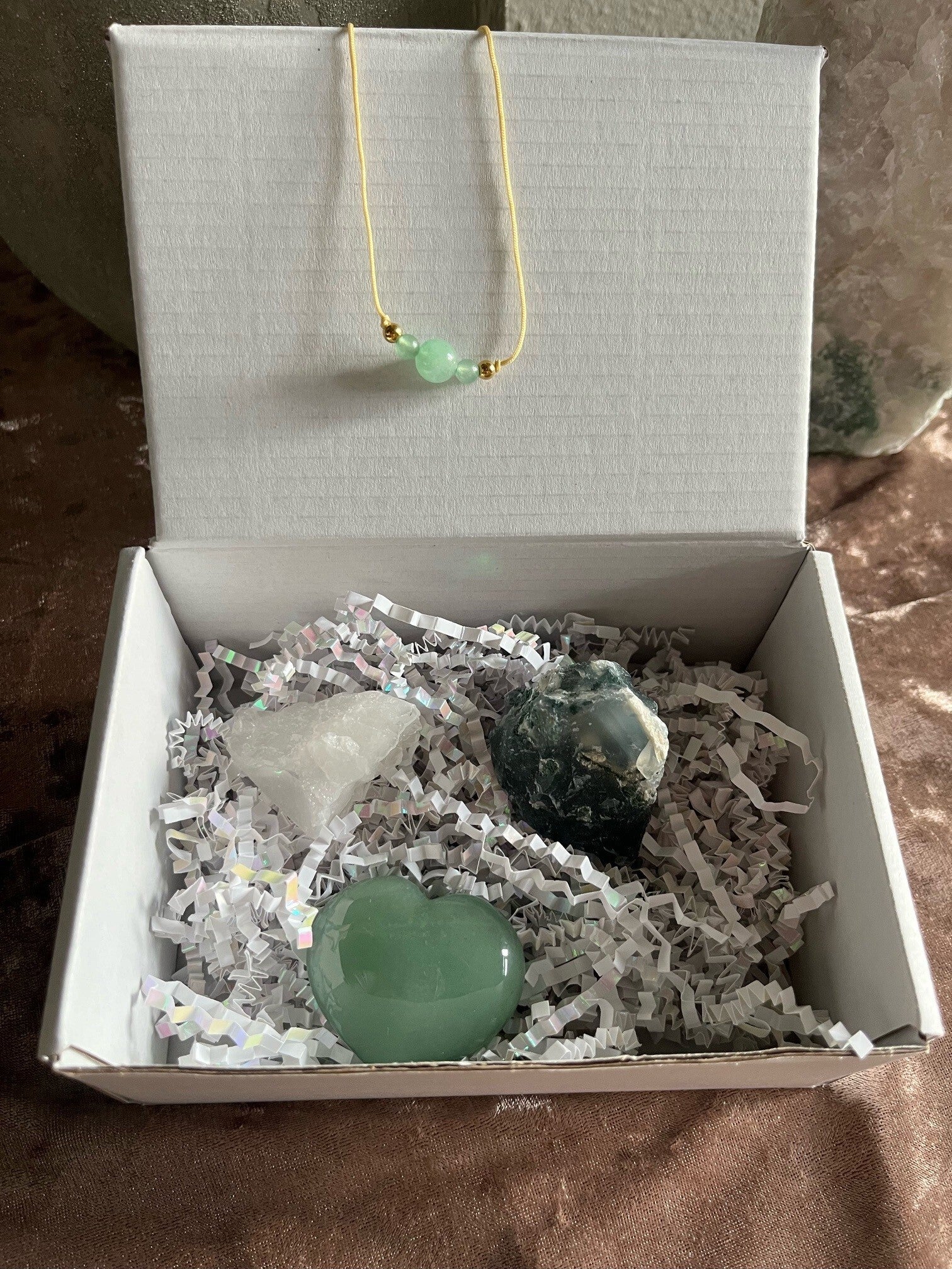 Samen brengen deze edelstenen groei, balans en helderheid: Avonturijn opent je hart, mosagaat stabiliseert je energie, en bergkristal versterkt en zuivert alles voor een frisse lentestart